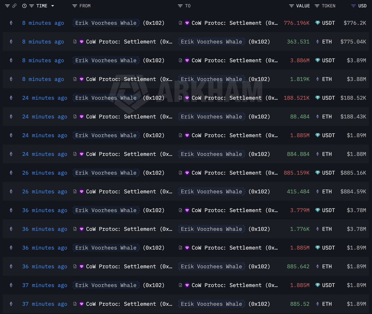 A mysterious whale, labeled as linked to Erik Voorhees, spent another 30.72M $USDT to buy 14,425 $ETH.