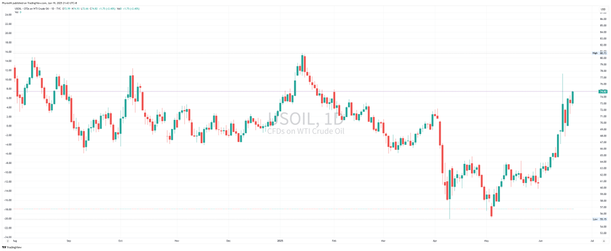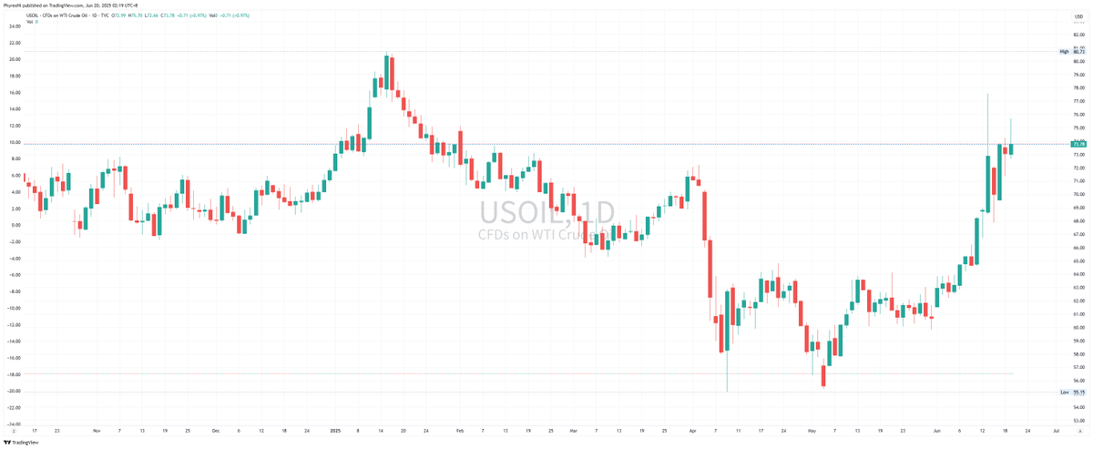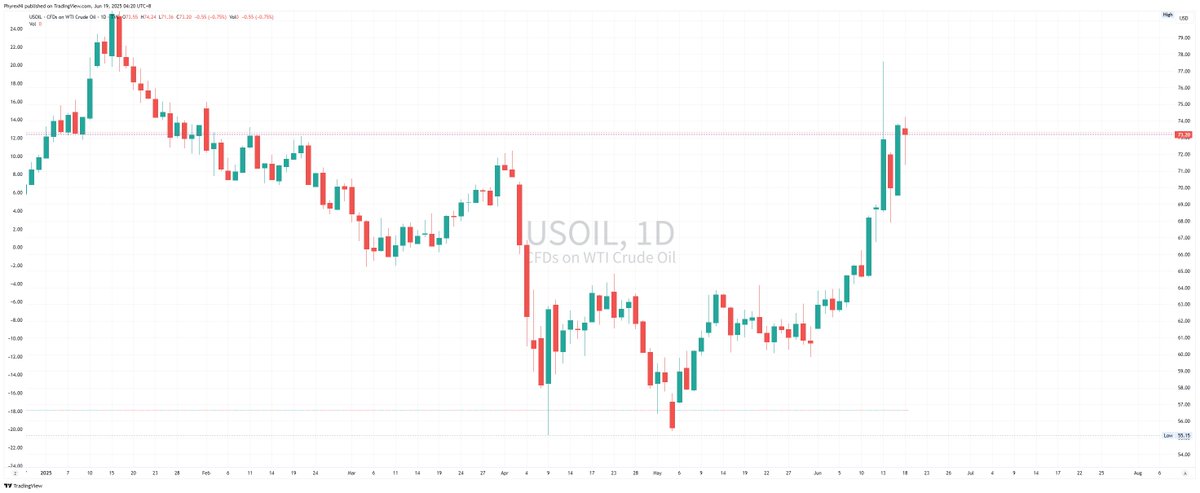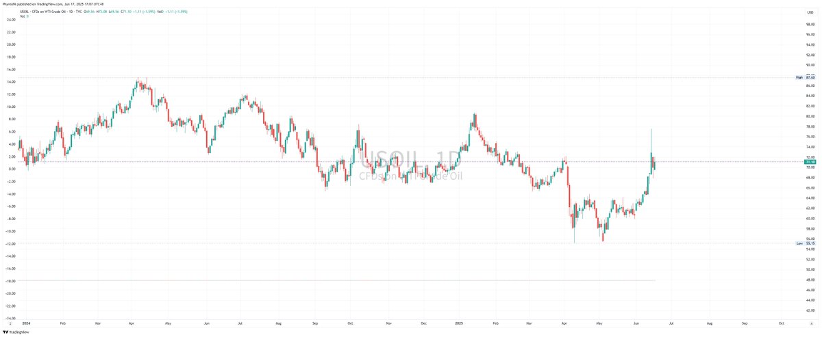 中午起床的时候就看到 $USOIL 上涨,最高涨到了 72 美元,估计就没什么好事,所以即便是不懂地缘冲突,看 WTI 的油价也能知道大体发生了什么事。