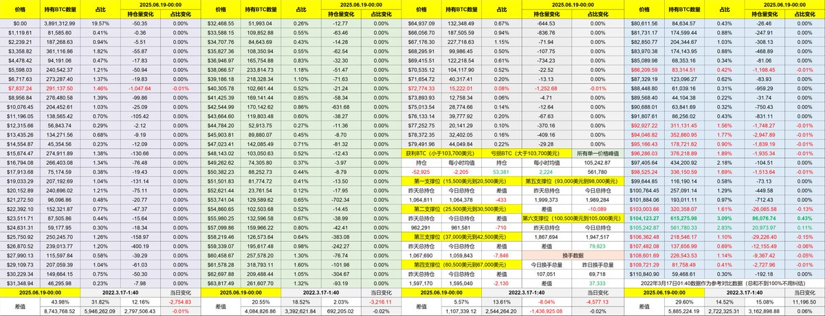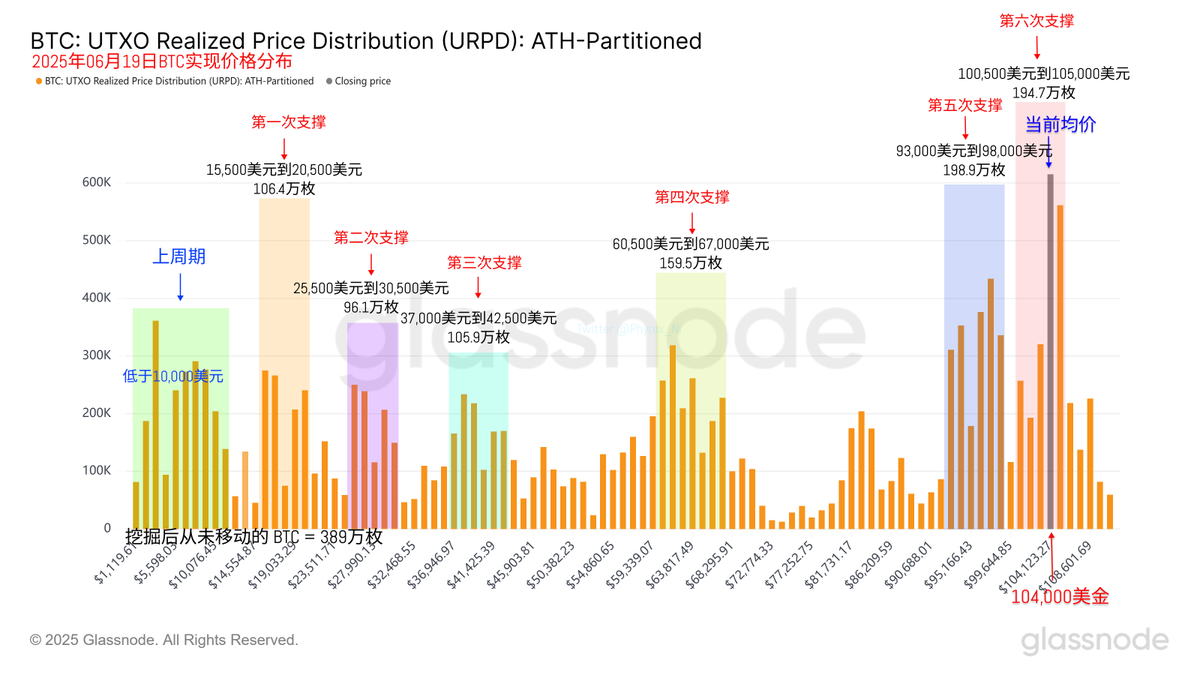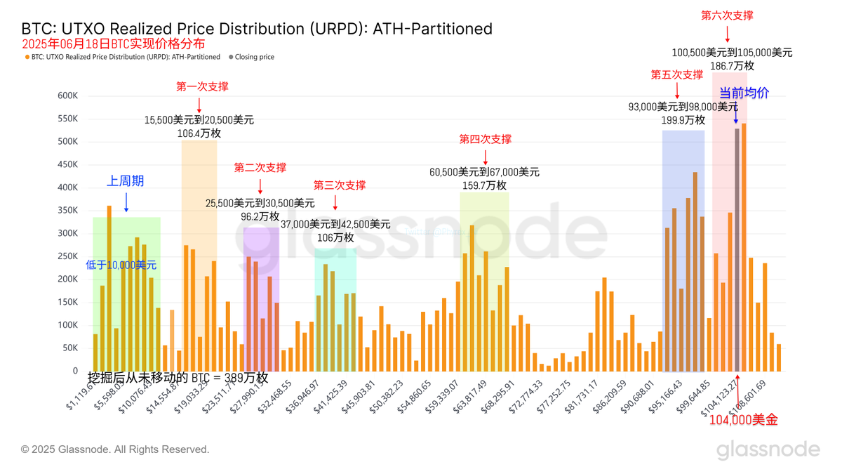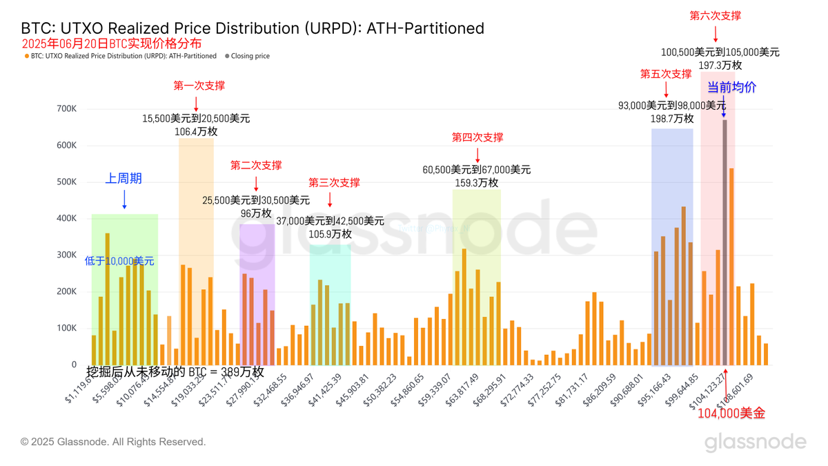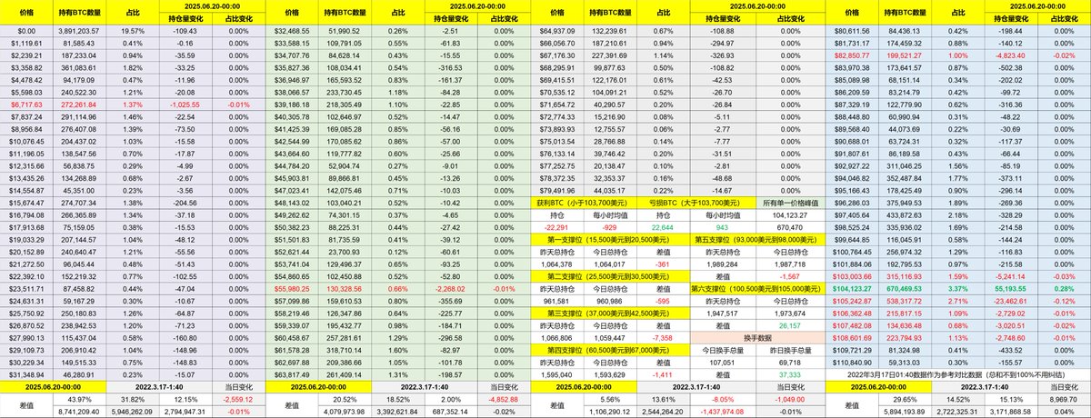 从支撑的数据来看 93,000 美元到 98,000 美元的支撑仍然很坚固,但 100,500 美元到 105,000 美元之间的筹码堆积在继续提升,这个区间的存量很快就会超过支撑区的存量,尤其是 104,000 美元到 105,000 美元之间的存量已经超过了120万枚 $BTC 。