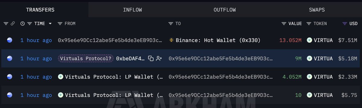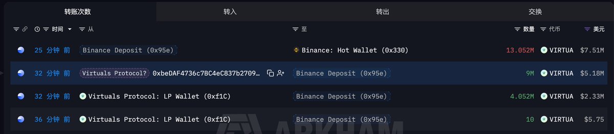 半小时前,两个 @virtuals_io 项目方钱包把 1305 万枚 $VIRTUAL ($751 万) 转进了 Binance。