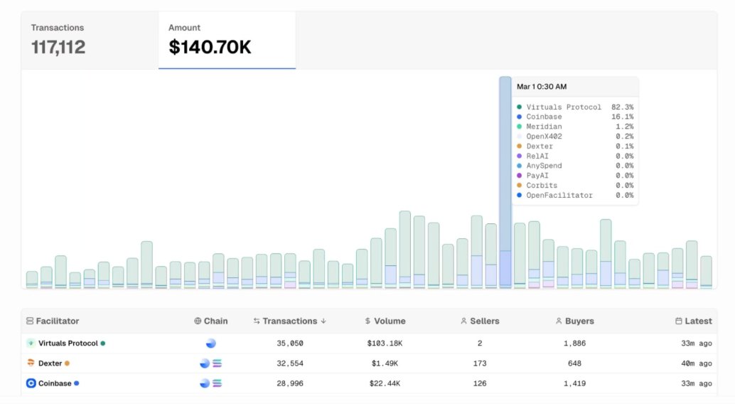 Virtuals 的 x402 服务器在 aGDP 激励启动后15天内创造:63万笔交易、300万美元交易量、1.7万用户,单这个服务器就把其他所有 x402 服务器甩开几条街,第二名差了几十倍