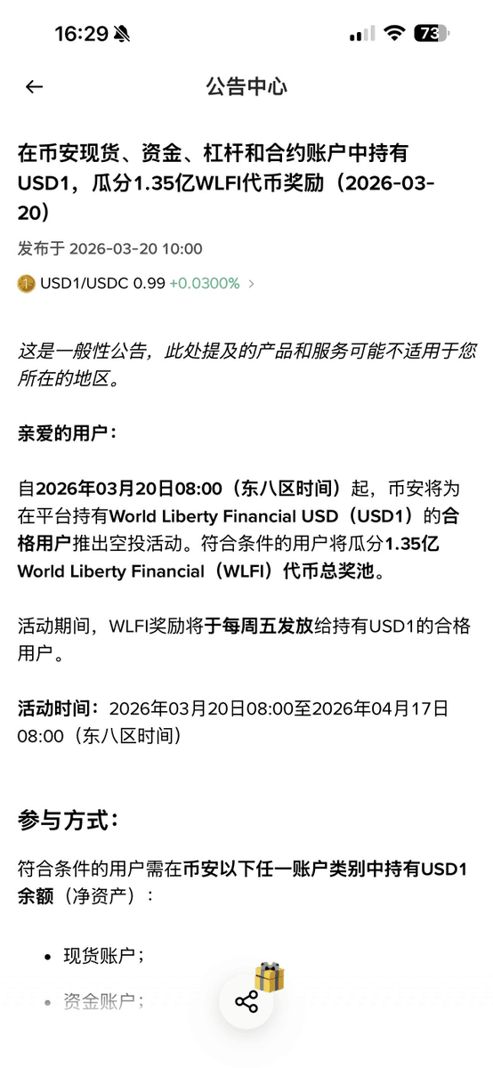 规则依旧,在币安的现货、资金、杠杆、合约账户里持有USD1就能参与。如果在合约或杠杆账户里用USD1当抵押品,还能拿个1.2倍的加成。这次活动公告是3月20日发的,参与门槛跟之前基本一样,算是比较熟悉的玩法了。