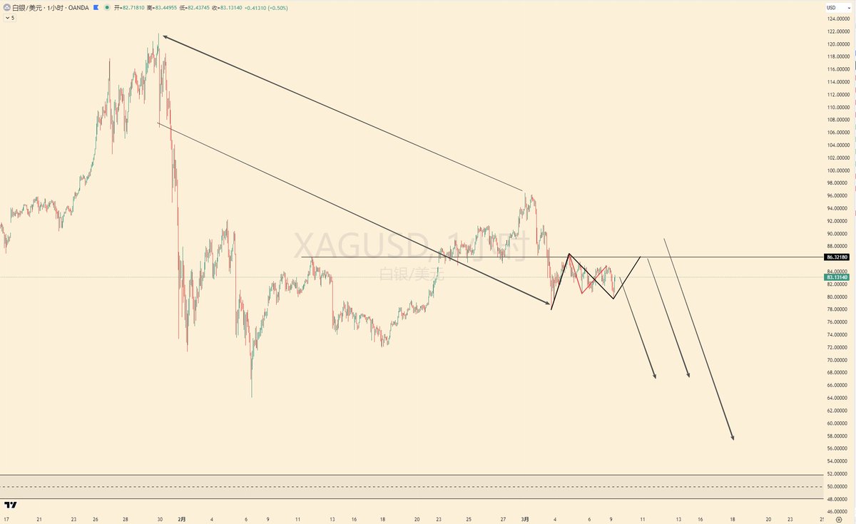 $XAG 白银的集中走法的可能性。 第一波下跌的第一段的反抽很强,那么理论上第二波下跌的第一段下跌的反抽应该没那么强。 目前形态上也是这么走的,但是市场永远是对的,用盈利和仓位控制一下。