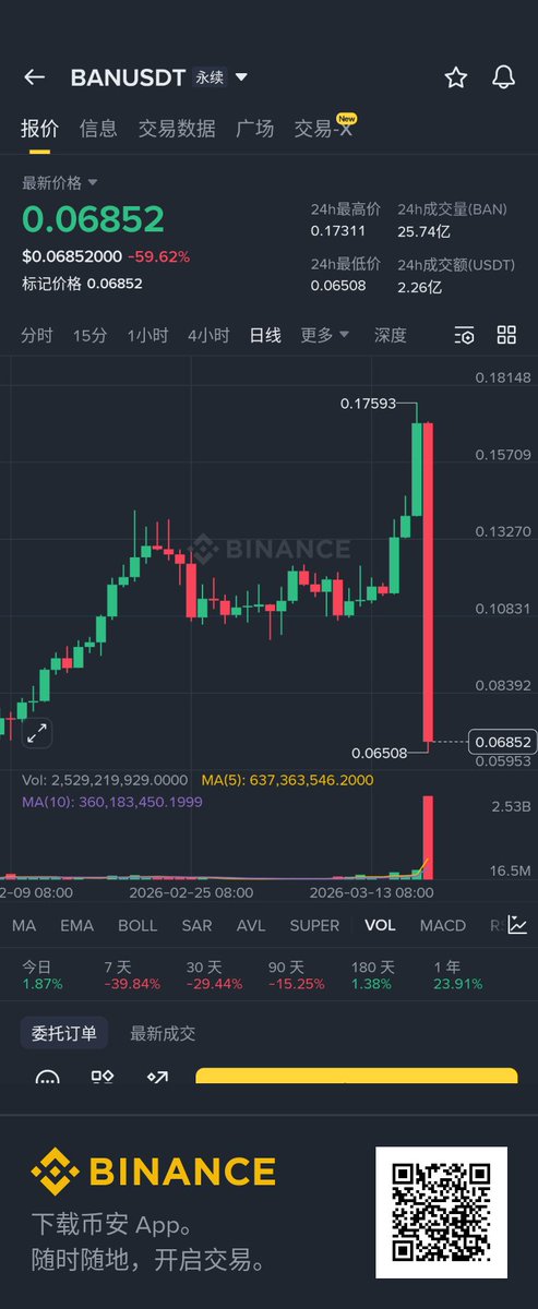 $BAN 你如果纯玩现货,虽然这叼毛乱拉乱砸,但你只要不是这两天进的,基本上没太大事,玩合约基本都爆了,多空全炸。最惨的就是底部翻倍,觉得自己是传奇交易员,盘感来了,该回调了,加仓开大倍数追空,然后原地拉5倍直接爆掉,反手再砸把追多的一起爆。
