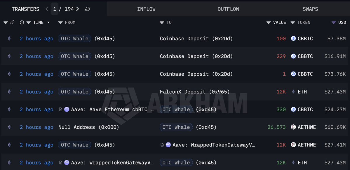 This OTC whale continues to buy the dip! He bought another 33,000 $ETH($76.6M) and 250 $CBBTC($18.95M) today.