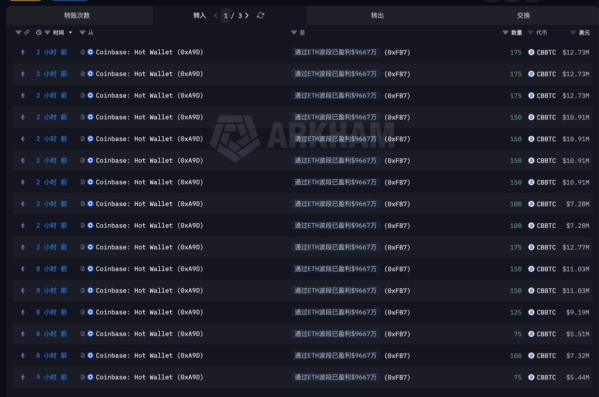 老哥不语,只是一味的框框买入💰 「ETH 波段获利 9922 万美元的聪明钱」过去 8 小时又囤积了 2500 枚 cbBTC,价值 1.82 亿美元,一次比一次买得多… 自 02.02 以来他已累计从 #Coinbase 提出 4000 cbBTC,平均提出价格 $74003.9,目前浮亏 299.5 万美元;不过老哥已经 2 天没有买 ETH 了,不考虑拉一把吗 钱包地址 https://t.co/cha5anhZte 本文由 @Gate_zh 赞助 |上 Gate App 抢黄金