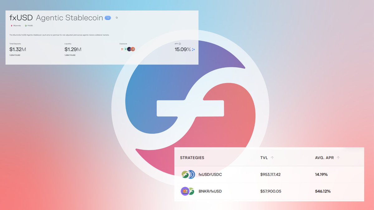 AI Agent 叙事正在迈入一个新的阶段 随着首个 $fxUSD Agentic 稳定币金库Vault的上线,AI 资产第一次以更成熟的金融形态,正式接入 DeFi 基础设施,这不仅是一次产品更新,更是一次资产属性的升级 此次金库由 nine Summits 策展,并基于 Morpho 的优化架构构建,专为 AI 赛道设计,它的核心目标很清晰——让那些被长期看好的 Agent 类资产,从叙事筹码转变为可产生现金流的生产性资产 从现在开始, $BANKR 、 $CLANKER 、 $VIRTUAL 、 $VVV 等代币持有者,都可以将手中的资产作为抵押品,借出 $fxUSD 。你无需卖出筹码,也不必放弃未来的上涨空间,却可以提前释放流动性。对长期看好 AI 叙事的人来说,这是一种更优雅的资金管理方式 与此同时,如果你本身持有稳定币,也可以选择将 fxUSD 存入金库。除了借款利息收益之外,还有额外的 fxUSD 激励,综合激励最高可达 15%。在当前市场环境下,这为稳定币提供了一个更具吸引力的收益出口 过去,早期叙事型代币往往意味着锁仓式信仰。一旦需要现金,只能被迫卖出,甚至错失后续的行情爆发。如今,借助 fxUSD 金库机制,你可以在保留仓位的同时获得流动资金,让资产运转起来,而不是静止等待 Agentic Finance 与稳定币的结合,正在为链上机器经济打下基础。AI 不再只是概念或话题,而是逐渐成为被金融体系承认和利用的资产类别 这只是 Agentic DeFi 的开始,流动性已经打开,接下来,就看你如何使用它:https://t.co/4ESlxI4vBh #fxUSD @protocol_fx @FX100Perp #DeFi #AI