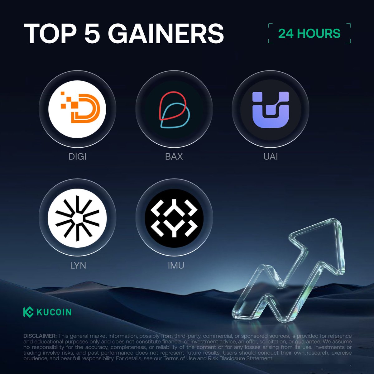 🚀 24H Top 5 Gainers on #KuCoin (March 13, 2026) 1. $DIGI - $0.00002 (+190.59%) 2. $BAX - $0.00002 (+81.02%) 3. $UAI - $0.34 (+57.45%) 4. $LYN - $0.31 (+57.44%) 5. $IMU - $0.00391 (+48.02%) Check Out Today's Top Crypto Gainers on KuCoin!