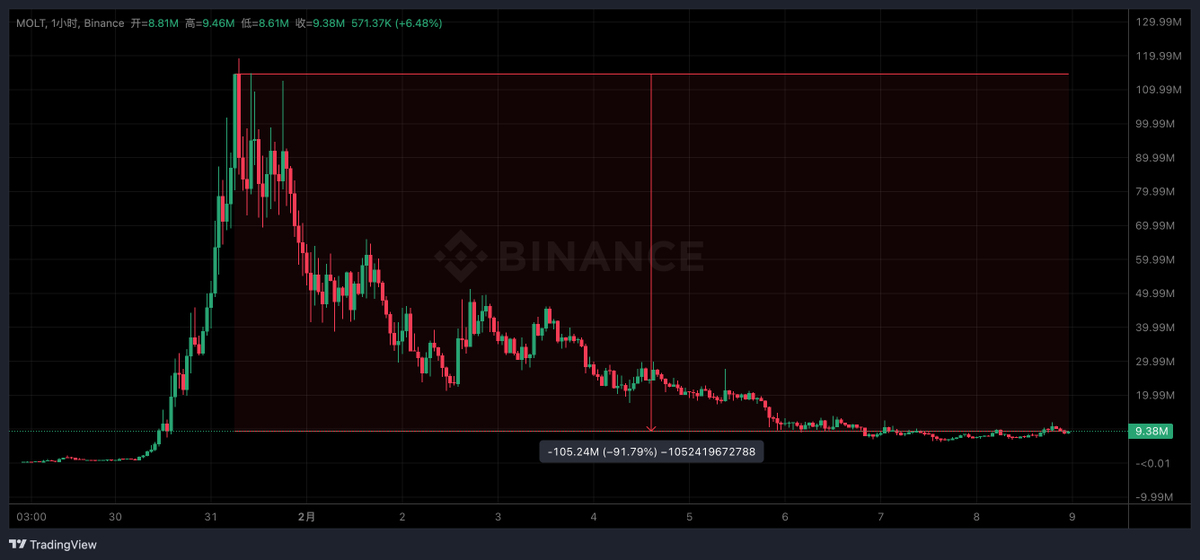最好的叙事套住了最多的人... 短短一周的时间 $MOLT 从高点跌了 -90% 了
