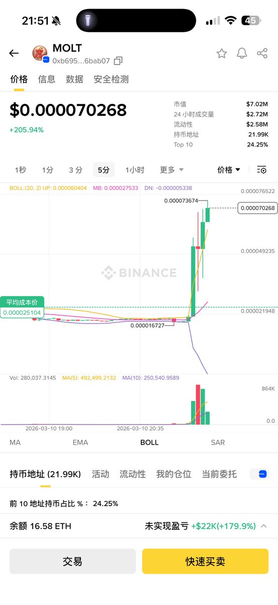 牛逼的人已经盆满钵满 这么好的加料老酒换新瓶,多涨涨链上会热闹些 $molt 上个币安合约问题不大