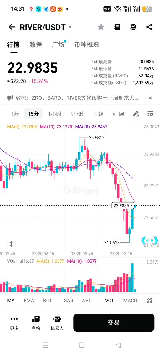 傍晚的时候 $RIVER 价格短暂跌破了20刀
