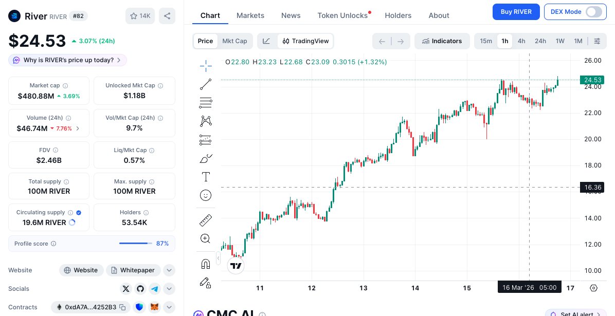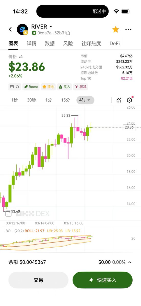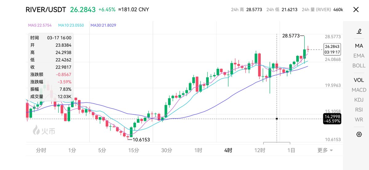 热门代币三 $RIVER$RIVER 今日成为热点主要源于其强劲的价格表现与积极的社区活动。代币价格从3月10日的低点$10上涨至$24,涨幅达140%,吸引了市场关注。同时,项目第四季活动(S4)正在进行,鼓励用户通过社交互动参与,增强了社区活跃度。此外,超过116万枚代币被质押,表明用户对项目长期发展有信心,这在充斥着短期炒作的市场中显得尤为突出,进一步推动了热度。