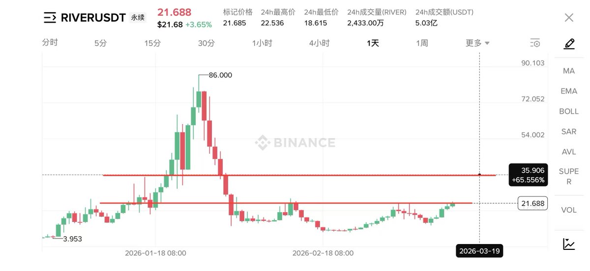 关键日子:3 月 22 日。 三天后会有约 110 万枚 $RIVER 的大额解锁。今天的拉升极有可能是为了在解锁前拉出足够的“护城河”空间。