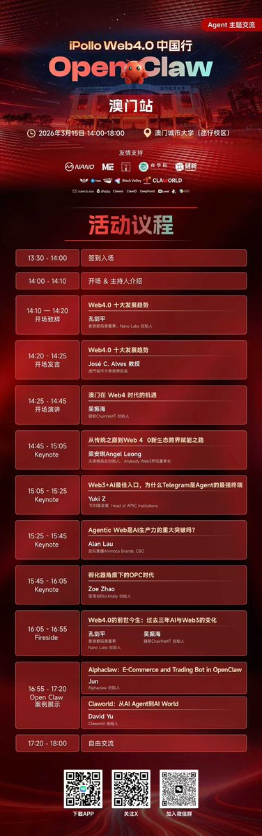 感謝鏈新 @ChainNeXT_ 跟 @CryptoFi_Forum 在澳門城市大學舉辦的 Web 4.0,讓我有幸第一次線下近距離見到孔總 @JackClawAI ,見識到一堆業界大佬分享。學到了不少。
