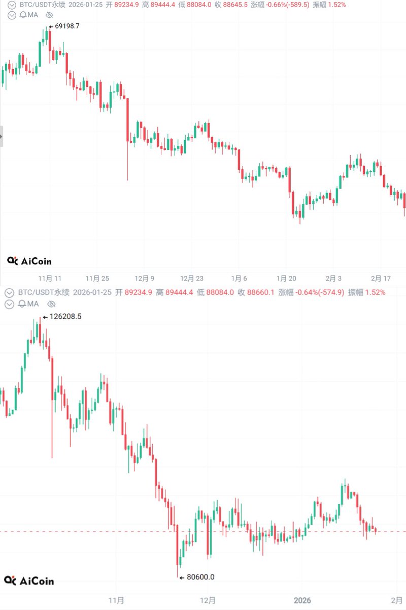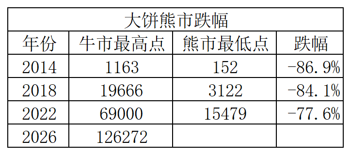 那么2026年的熊市,大饼目前从12.6万跌到最低8万,跌幅36%。
