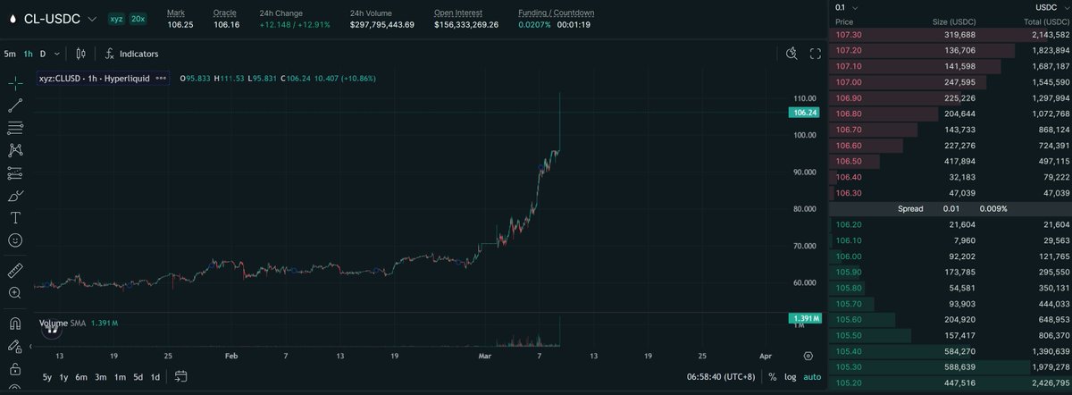 7*24开放交易,非常适合在美股盘前盘后的时间针对突发事件、财报等押注。本周末尽管CL原油触及了最大价差限制,也达到了166M的24H交易量,如果你希望赶在期货开盘前针对新闻进行押注,XYZ已经成了少数具有可操作性的选择。值得一提的是,仅仅在刚刚原油期货开盘的第一小时,CL-USDC的交易量就达到了147M。