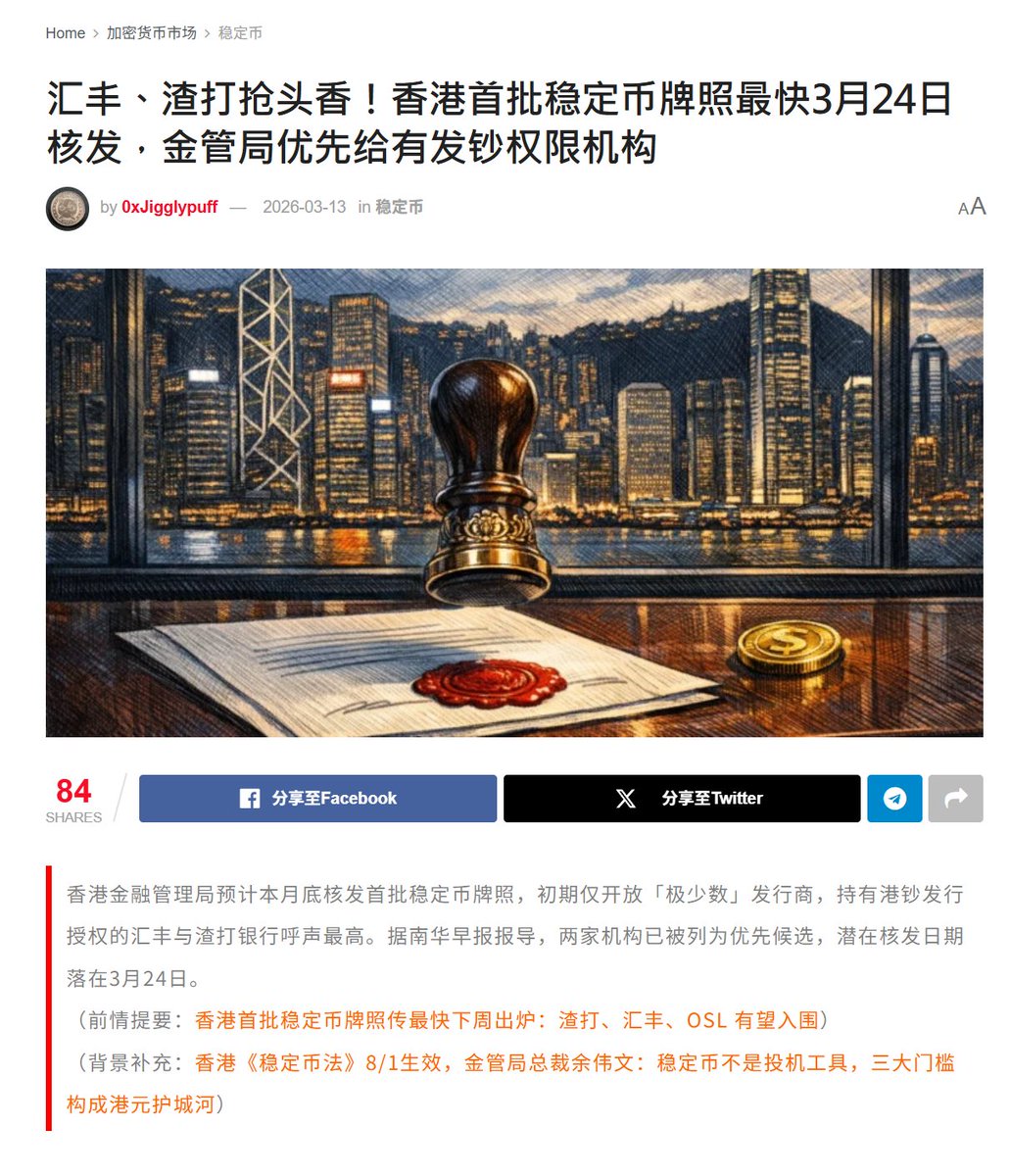 在美国率先通过《天才法案》之后,且监管规则制定完善、稳定币牌照尚未正式发出之前,香港卡住这个时间窗口,率先一步发出了稳定币牌照。