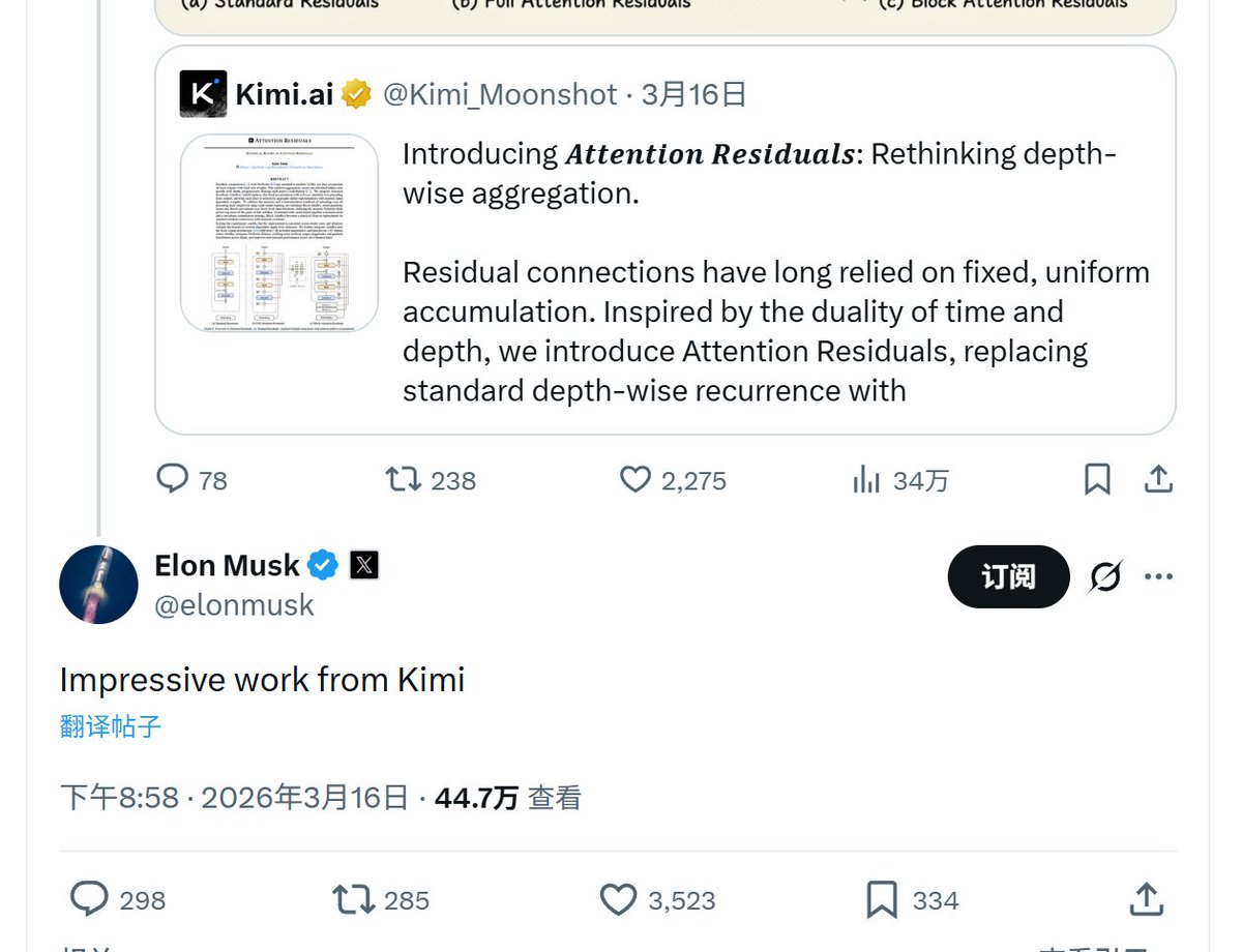 1.马斯克亲自转发了 Kimi 天才少年的论文,评价为印象深刻。