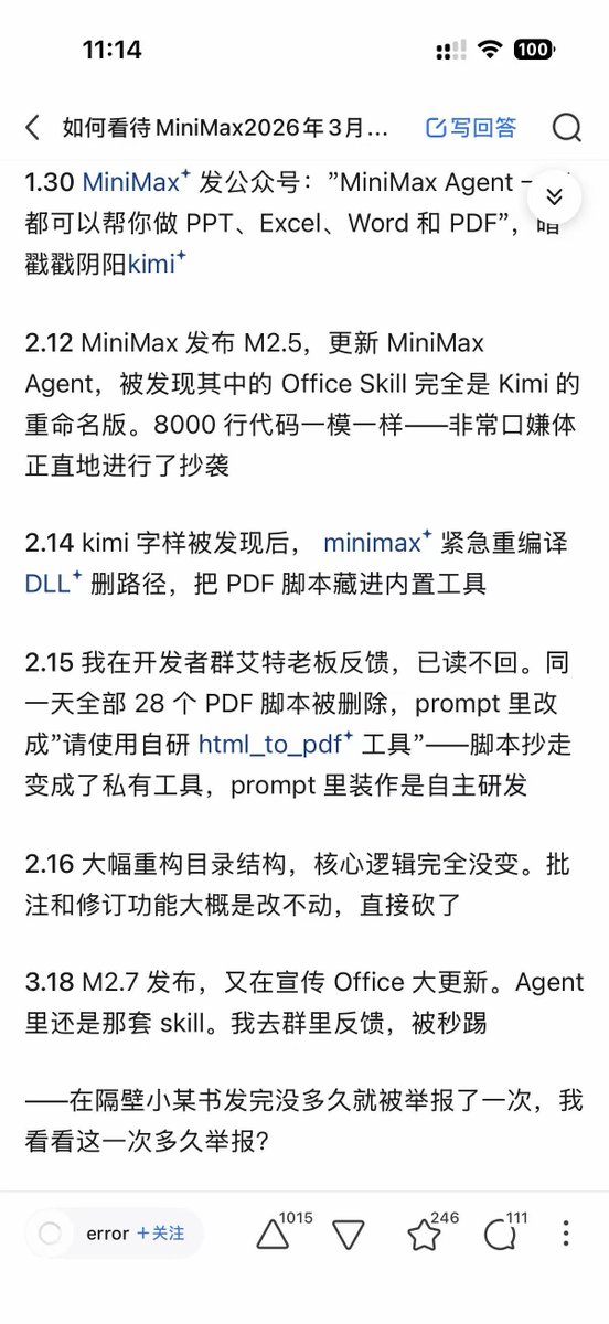 2.知乎上有人指控 MiniMax 疑似直接借用了 Kimi Office Skill 代码。