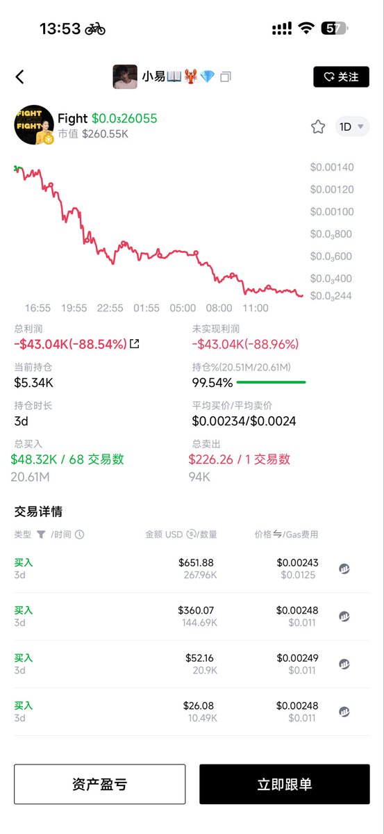 龙虾榜一大哥,前几天刚名牌一个地址玩玩 跟你们这些人Fight Fight Fight 2M多买的,现在直接差不多亏了90%,你们这些人,混🥚啊