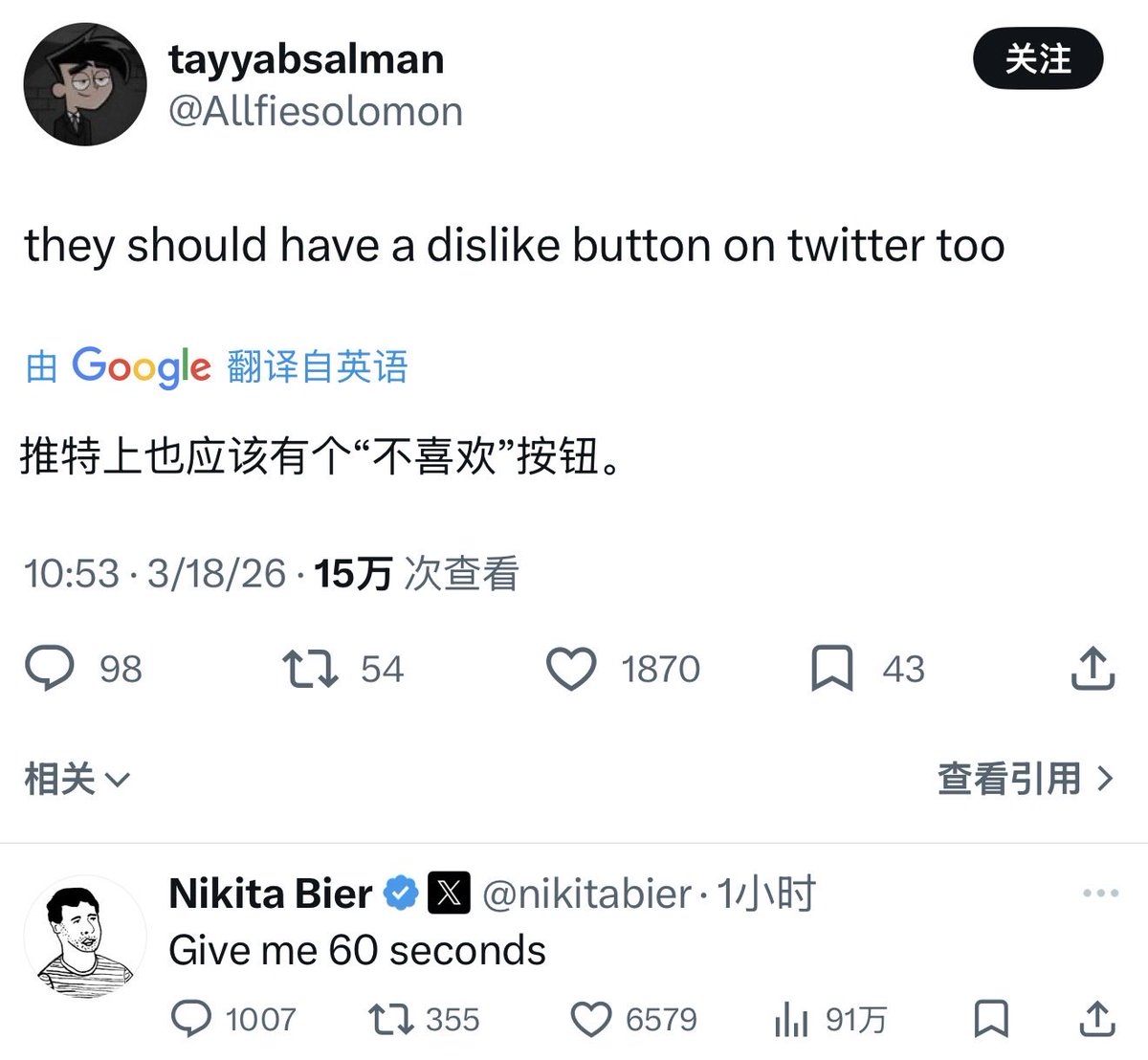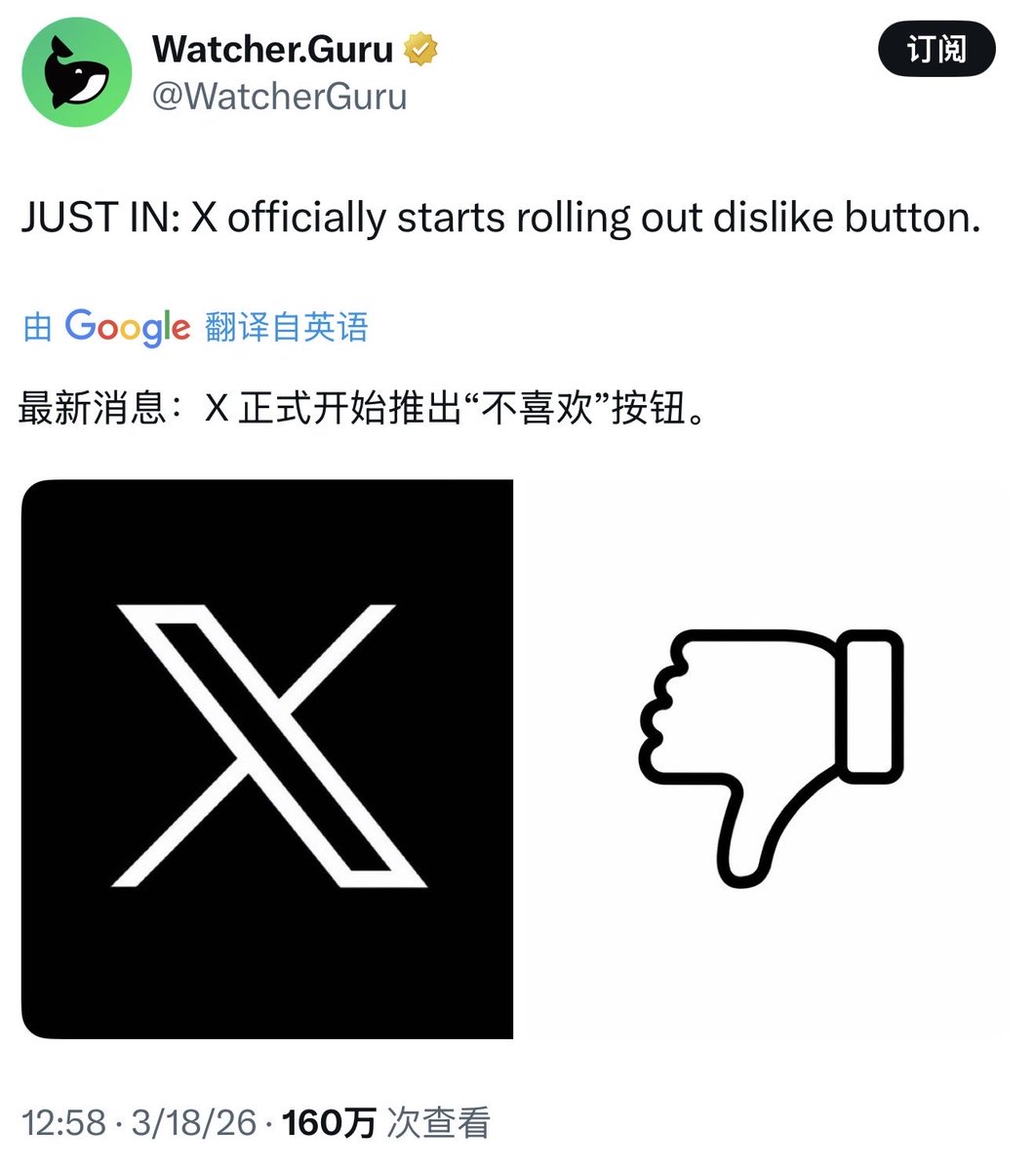推特正式开始推出“不喜欢”按钮了 Nikita Bier说60秒搞定,目前好像就看见少数人看见那个,我刚刚手机更新还没看到 我认为这个,应该对自身流量影响不大,更重要的是可以筛选你的时间线吧