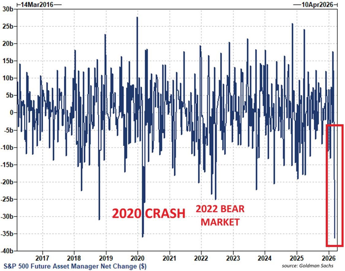 • 现在(2026 年 3 月):资产经理人单周净卖出 $36.2B S&P 期货(至少过去十年最大单周减持),ETF 短仓增幅 8.3%(过去 5 年仅超过 1 次),整体短暴露达 2022 年 9 月以来最高(甚至 3 年高),Gross exposure 近历史高点 307%。