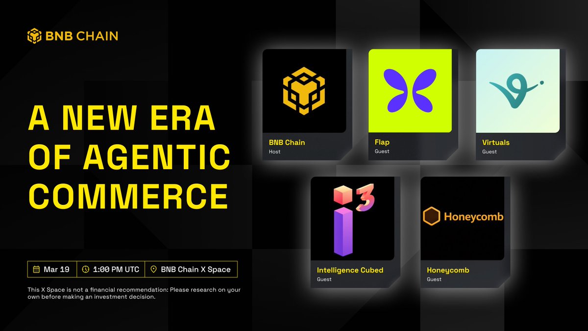 Join our X Space with @flapdotsh, @virtuals_io, @I3_Cubed & @honeycombchain to explore how agentic commerce will transform the next era of agent economy on BNB Chain.