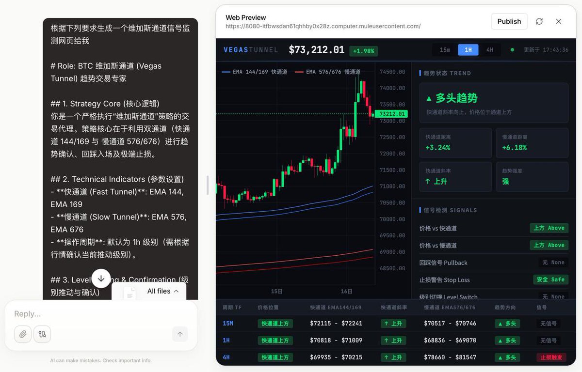 这种玩具级的体验根本没法当生产力,直到我发现 @mulerun_ai MuleRun,试了一把,分分钟就构建好了维加斯通道的交易策略!
