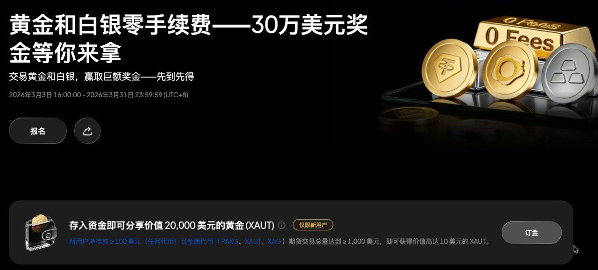 新用户只要净存款≥100美金(任意代币都行),再把PAXG/XAUT/XAG金属期货交易量干到≥1000美金,就能直接领价值10美金的XAUT黄金代币,白给的福利谁不冲!