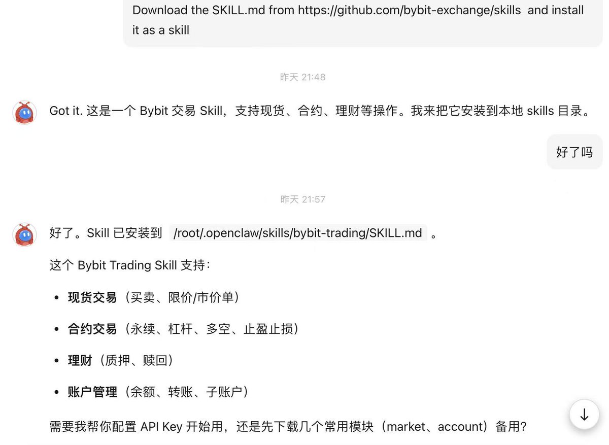 Bybit 宣布推出 Bybit AI Skills,我已经安装配置好了,让你用最熟悉的 AI 助手,实现「一句话交易」!✨