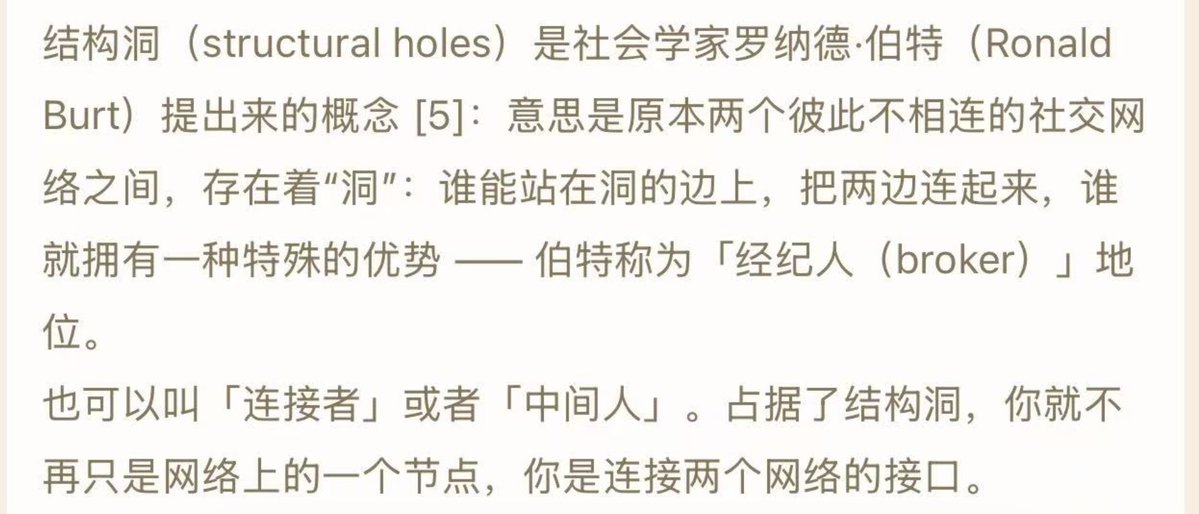 我的意思是,很多人以为阶层跃迁靠向上社交,其实更现实的是横向连接,结构洞的本质不是认识更多人,而是站在两个彼此不连接的世界中间。