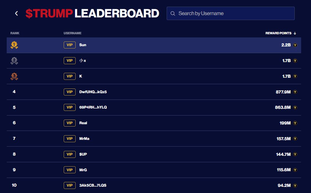 目前以“VIP Sun”身份领跑TRUMP memecoin 排行榜,积分高达22亿分,排名第一。
