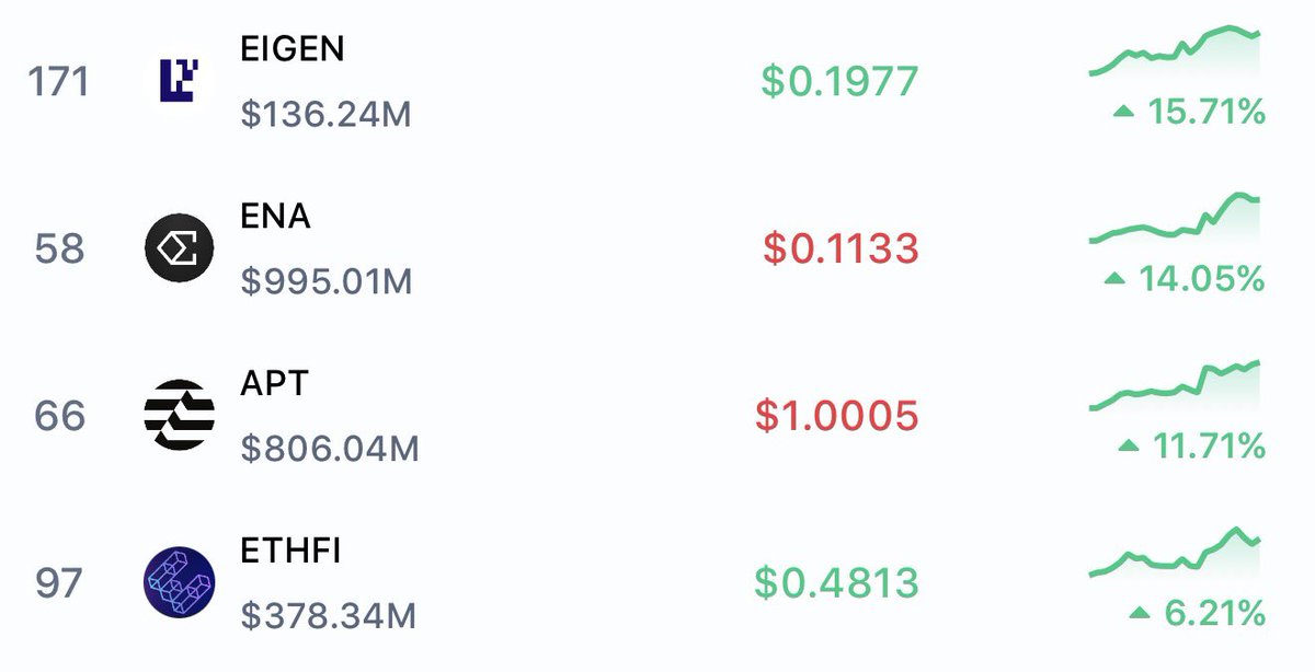 今天的爆发主要集中在 Restaking(EIGEN、ETHFI)+ DeFi(ENA)+ L1(APT)叙事轮动。这些币市值相对低(1-10亿刀区间),成交量+情绪容易被点燃,但也极易高位洗盘或闪崩。