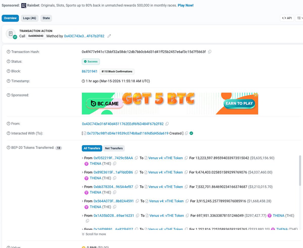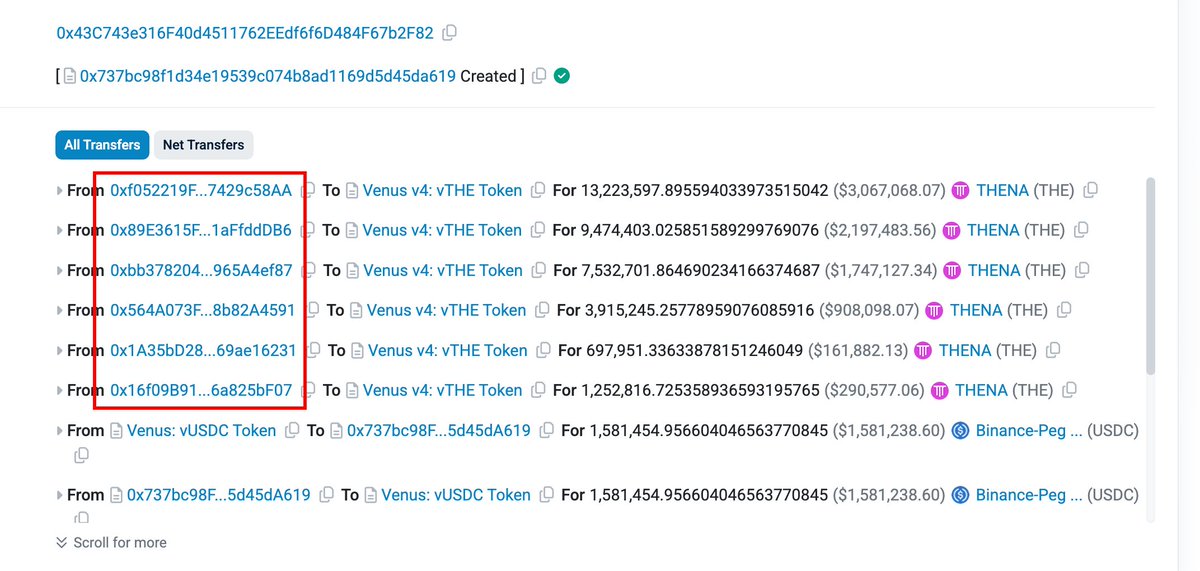 简单说应该是攻击者控制了大量的 $THE ,然后利用 @VenusProtocol 允许抵押 $THE 借硬通货的漏洞,在市面上爆拉了一波 $THE ,反正没啥流动性,一点点钱就可以。