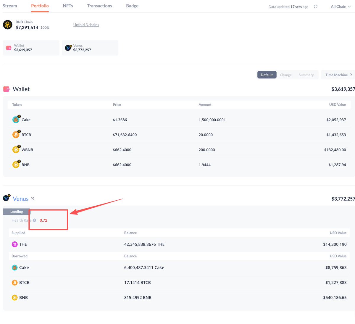 Venus的预言机是读链上的,瞬间他放进去的 $THE 就很值钱了,他就去疯狂的借了BTC Cake BNB等资产出来。