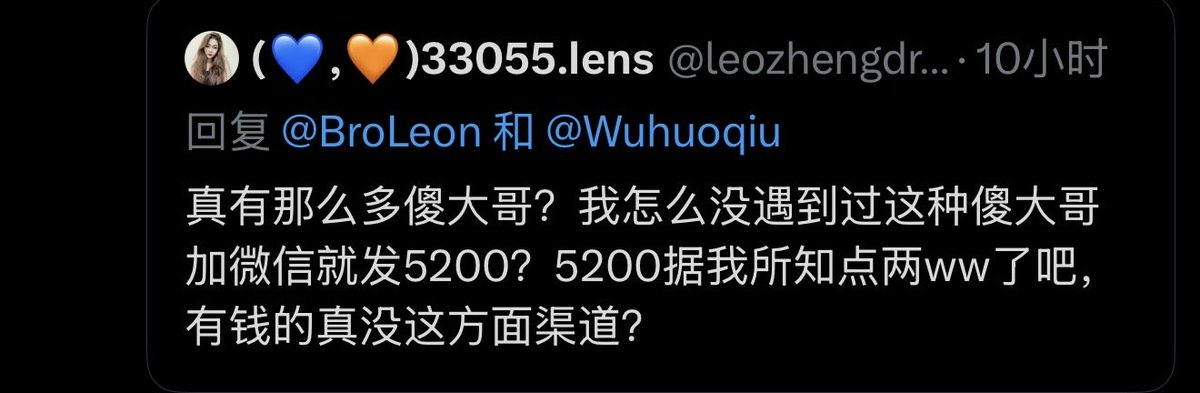 前面说那个小网红妹子说“几千块有啥意思,抖音小红书那些想加微信的男的大把上来直接发5200,3888的。两个礼拜折腾半天我还以为都能拿几万,十几万呢,没啥兴趣推特起新号。”