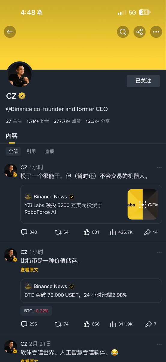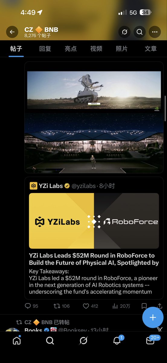 刚好看到一个小时前 @cz_binance 时隔一个多月在币安广场上又更新了一次,发了投资 Roboforce的新闻。