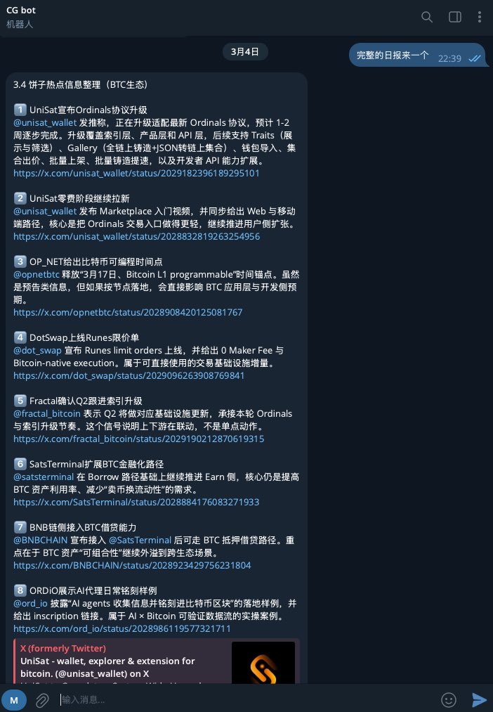 这两天做了 比特币生态的筛选 Skill,然后做了 CG哥 风味的日报渲染成稿 Skill,都还在优化调试中,这过程好玩有趣。