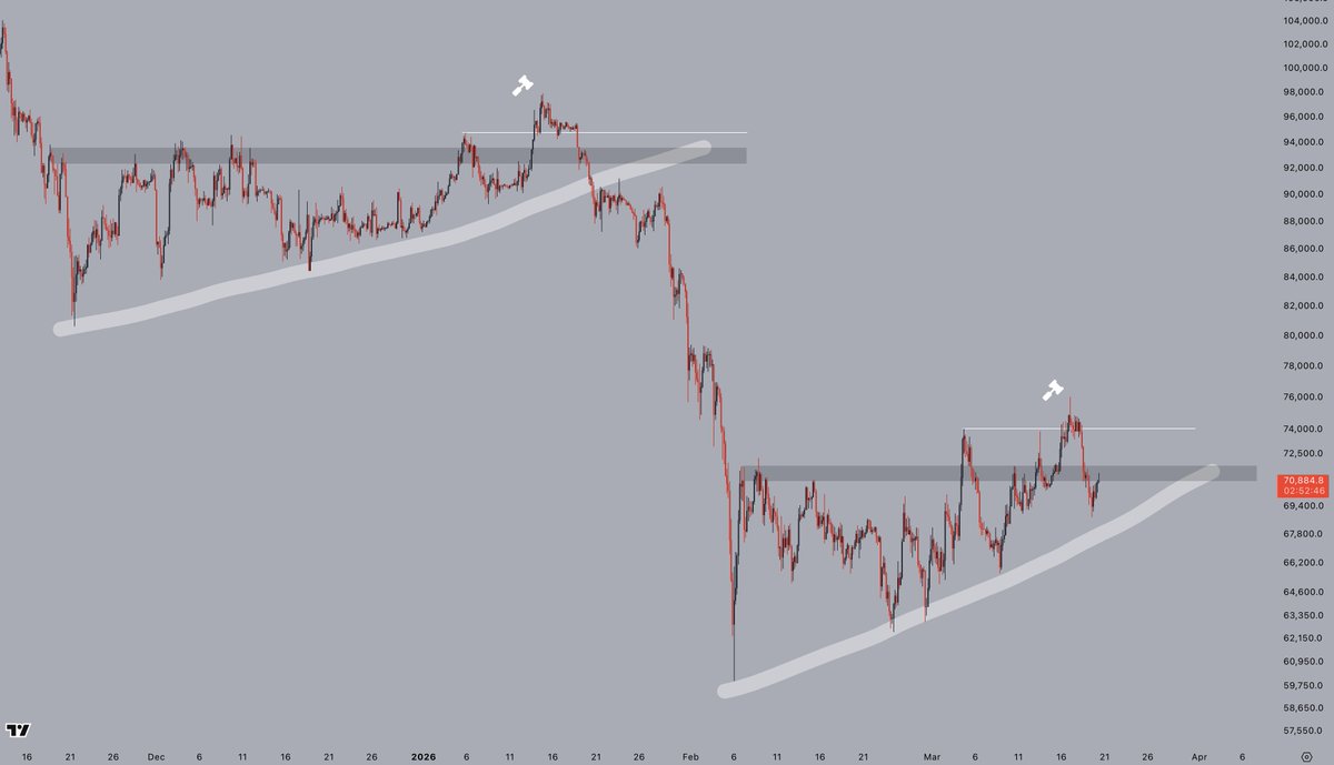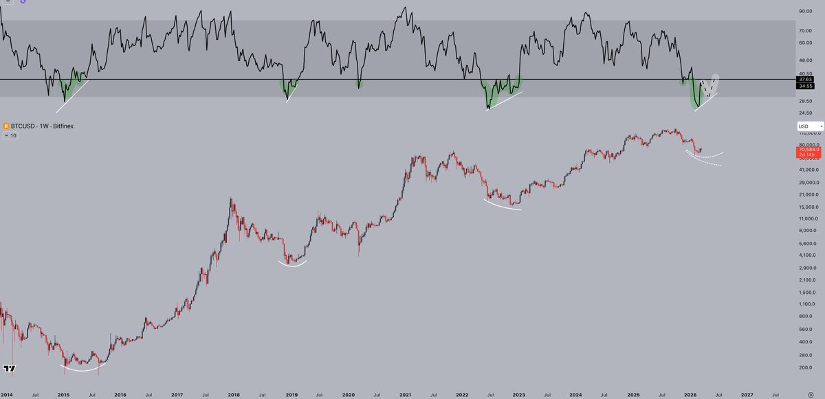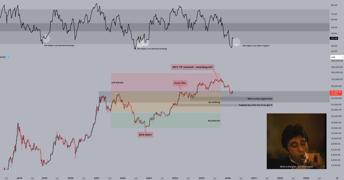 DCA starts either in those boxes, or when $BTC locks in a strong higher low on the RSI - whichever comes first.