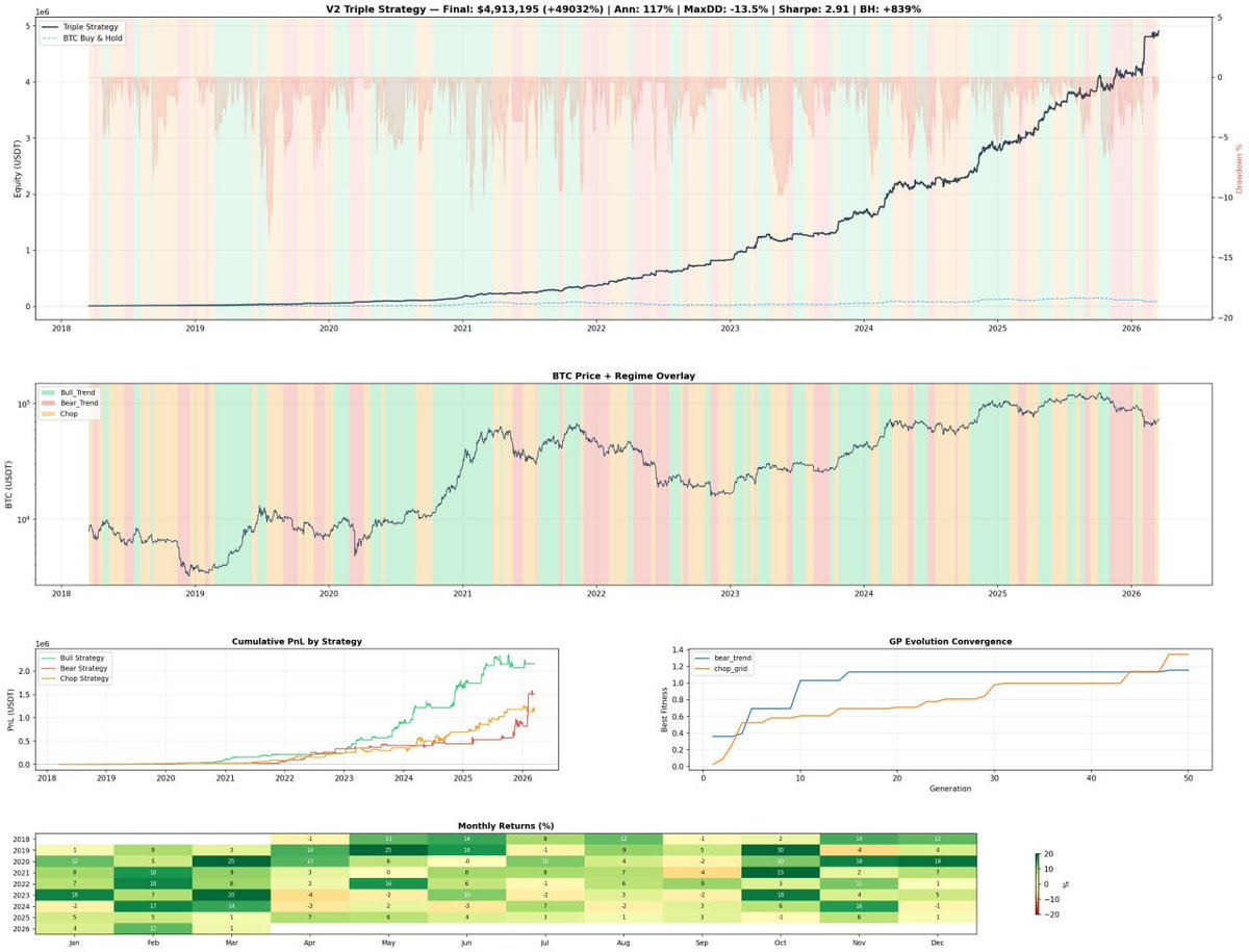 年化22%,最大回撤8.1%,夏普比率达到了2.13,最关键的 是,这还是在做空策略与震荡策略没有进化出明显盈利能力的情况下跑出来的...