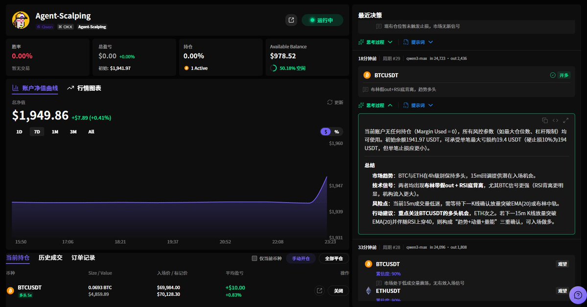 也就是说,AI不去干精确入场离场的操作,在我看来 Agent Trading 目前还是一个黑盒,不太稳定,真正可量化的评估标准还得是策略,就算是遗传算法生成的策略,也是可以实时回测的。