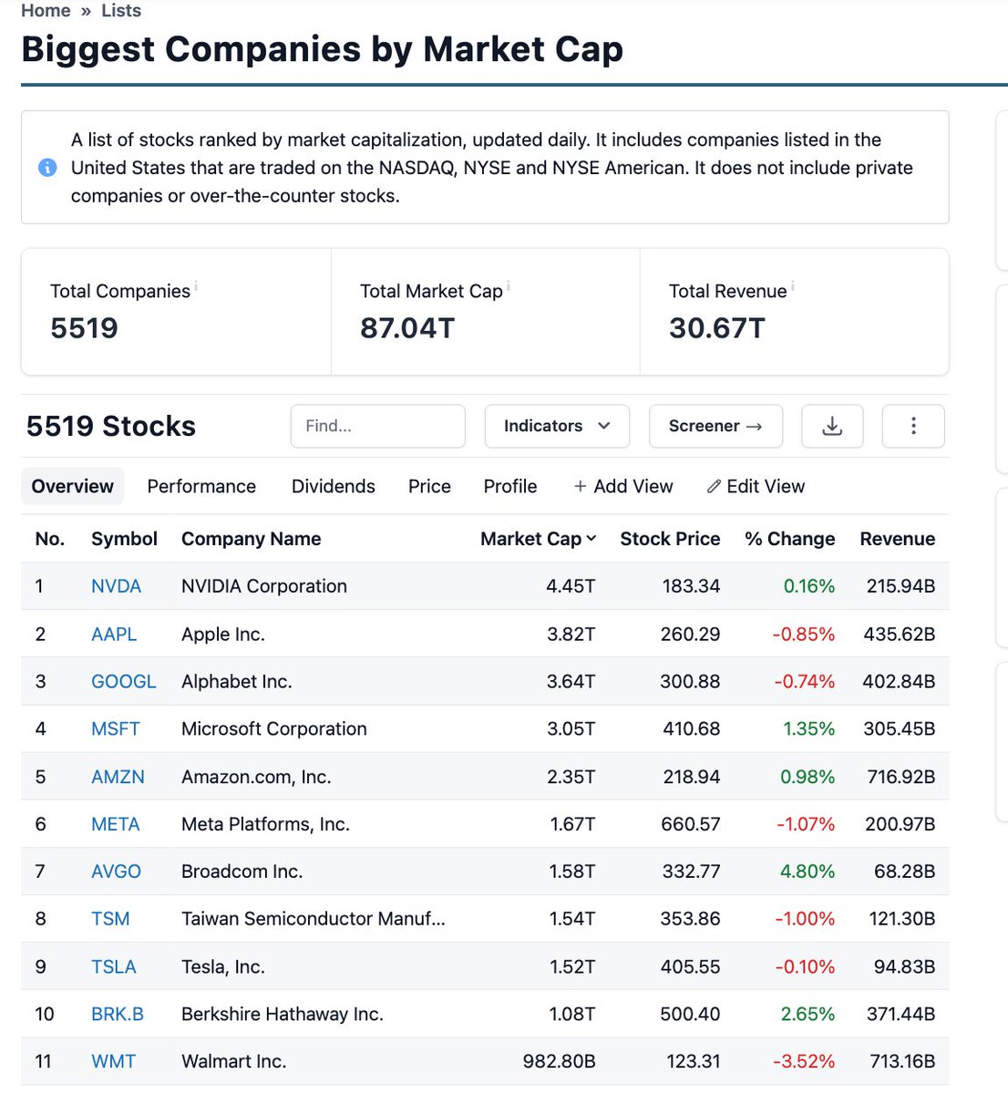 其实武兄说的没毛病。纳斯达克+纽交所等超过5,500家公司,市值高达87万亿美金。其中市值超1万亿美金以上的公司就10家,除了美股七姐妹,然后就是台积电,博通等