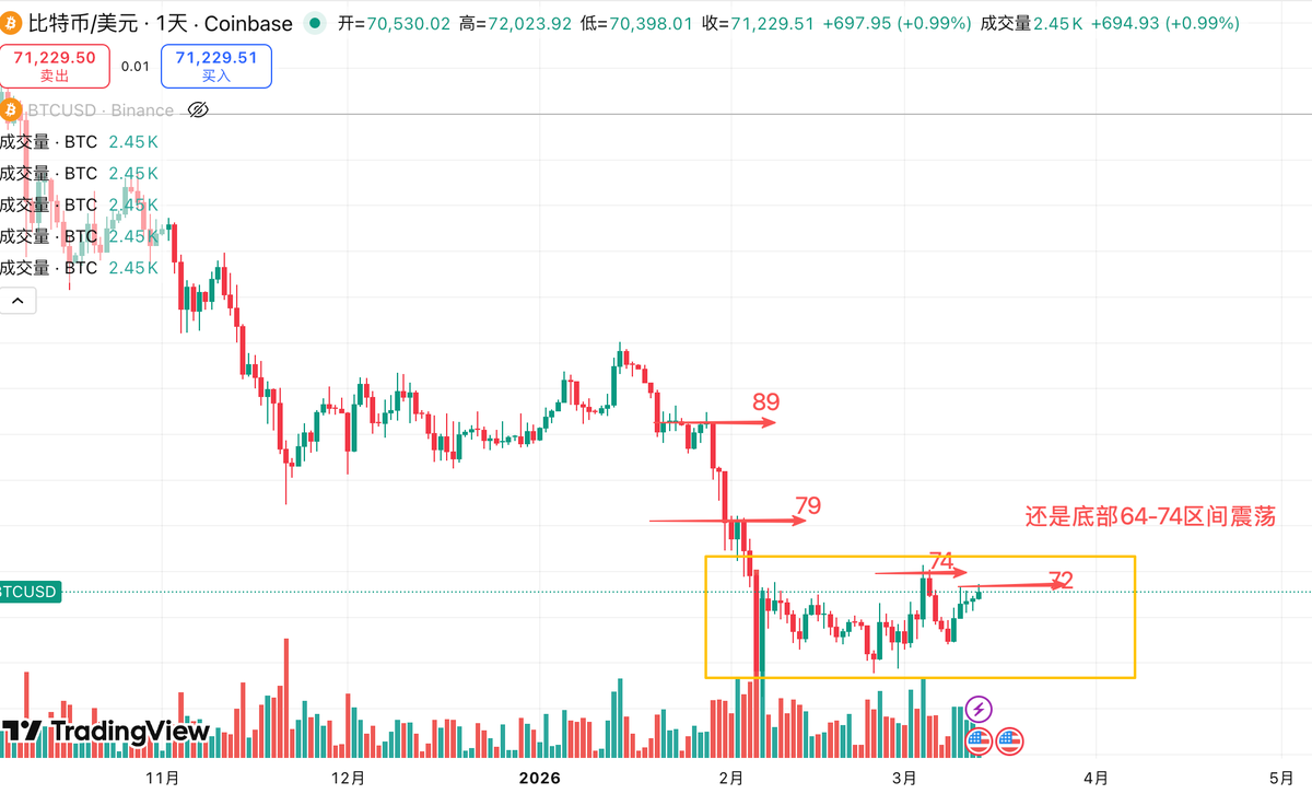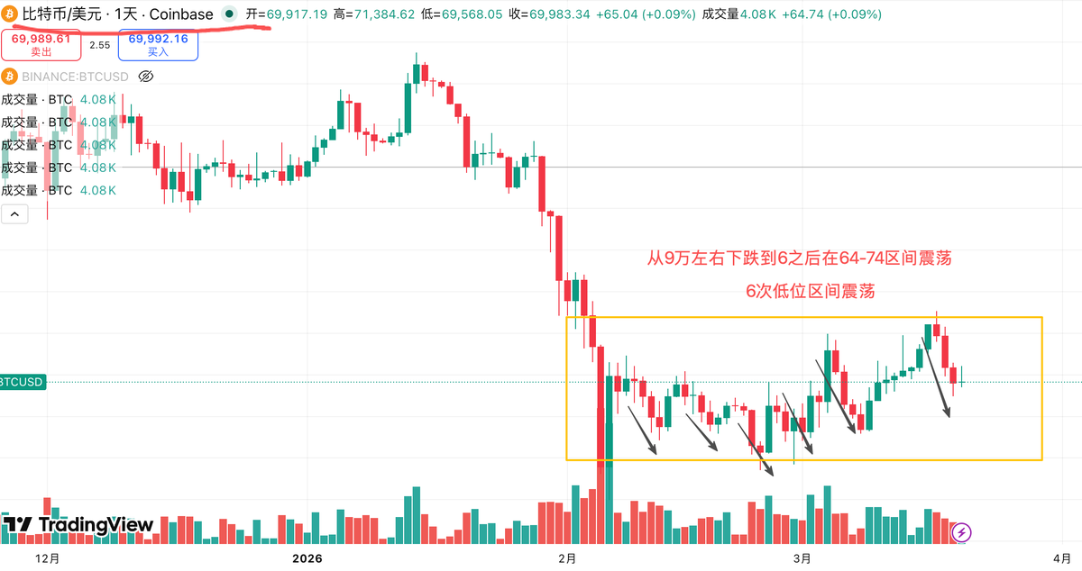 之前我还想着BTC可以在65-76甚至78区间震荡,现在倒好居然在63-70之间