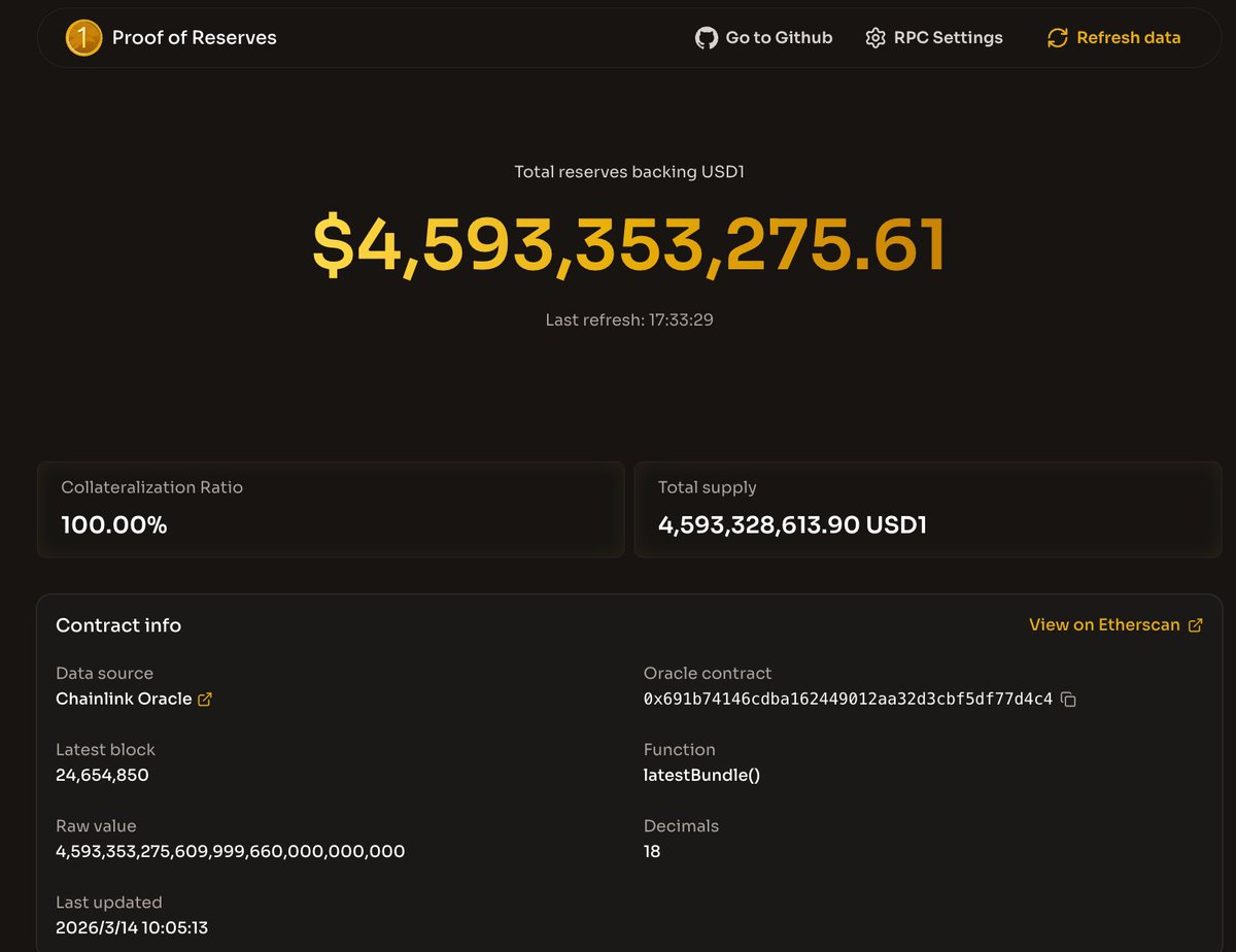 USD1的实时链上储备证明,用户可以随时验证其总供应量、储备资产以及抵押率。100.00% 的抵押率,然后Chainlink Oracle 每分钟自动化更新查看。作为持有者,这种透明度实时监控是我们普通用户能安心乐见的。