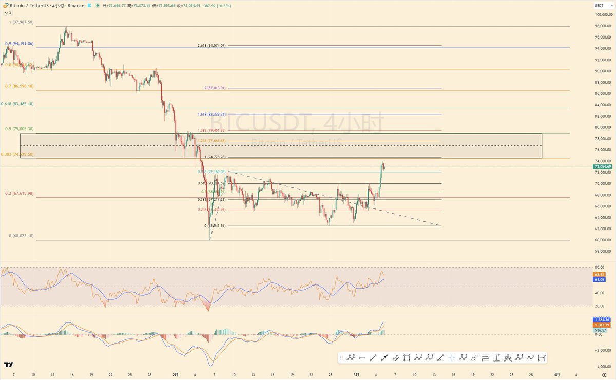 目前看BTC已经反弹到7字头。但向上真的是一步一个坎儿。73 78 这都是。而且前面63-65左右的筹码现在已经差不多盈利10个点。没有新的刺激。可能冲高还是不会很高。然后届时是否承压,会不会新低,仍需观察。