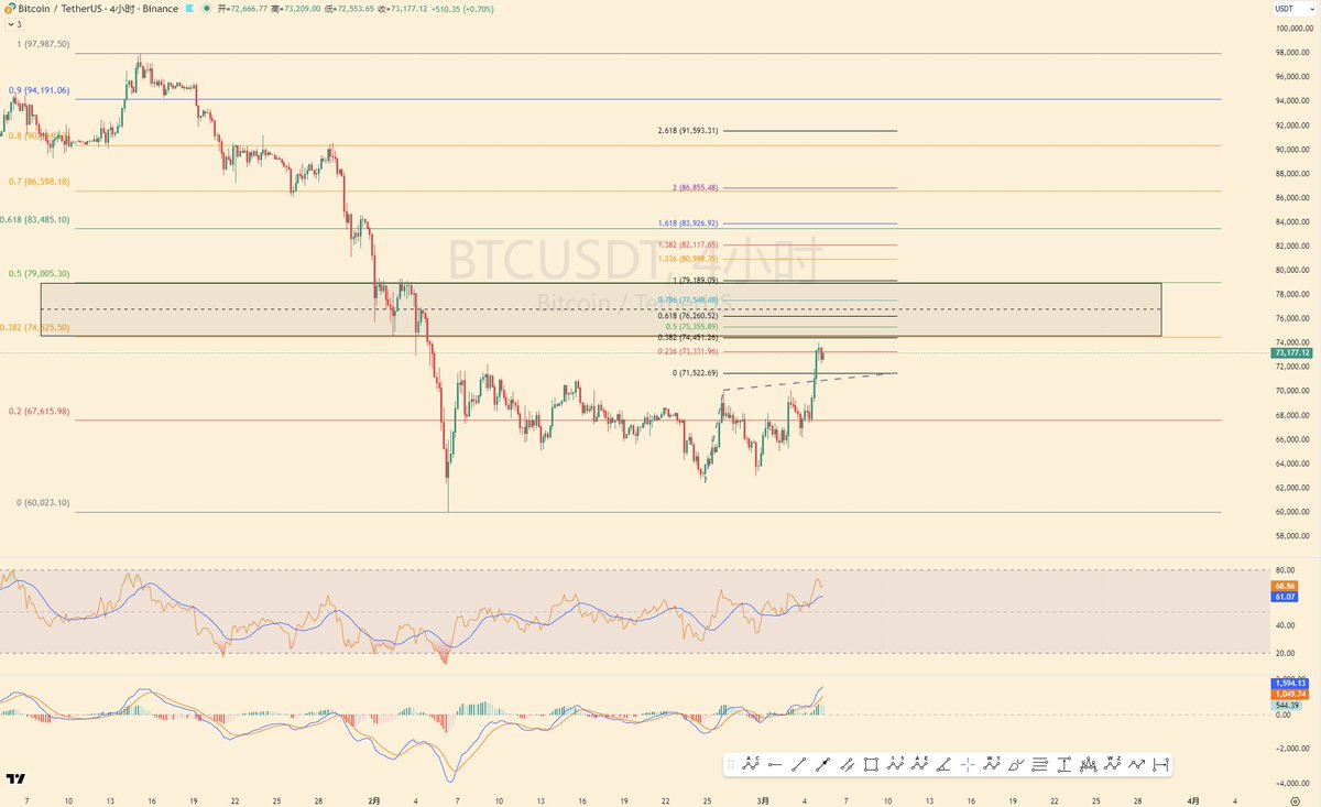 鉴于目前市场关注都在中东地缘,这份数据对于利率反映有限。但短期可能对风险市场情绪偏好回升,截止发文,美股盘前缓慢回升,BTC也冲高接近73,但风险市场可能还是震荡偏多些。