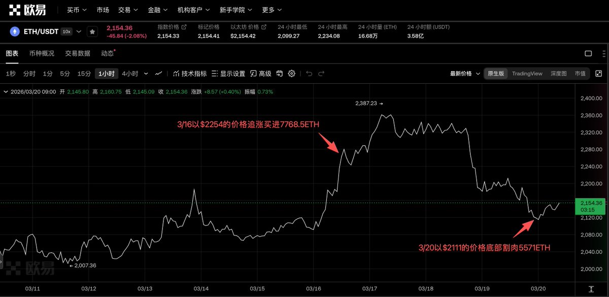 ◎4 天后的今天凌晨,他在 ETH 下跌 4% 后以 $2,111 的价格割肉卖出 5,571 枚 ETH ($1176 万)。