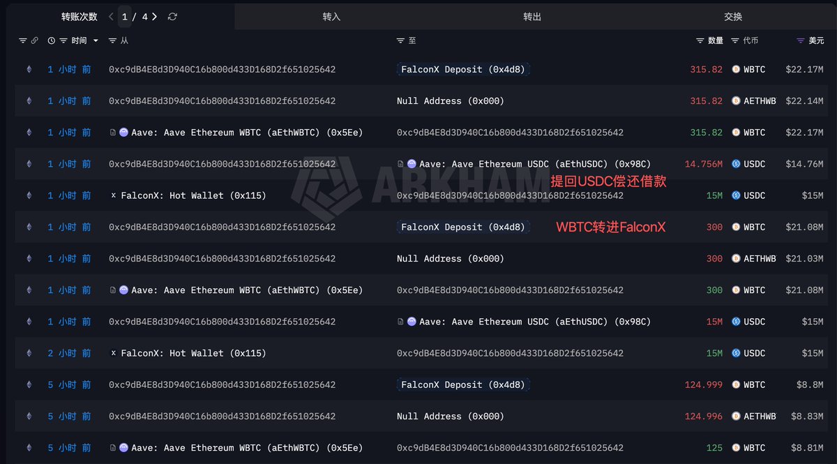 ◎今天,他在一小时前把这 742.8 枚 WBTC 通过 FalconX 以 $70,266 的价格清仓,提回 2975 万 USDC 还清了他在 Aave 上的借款。
