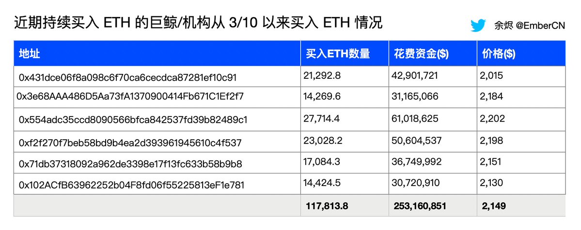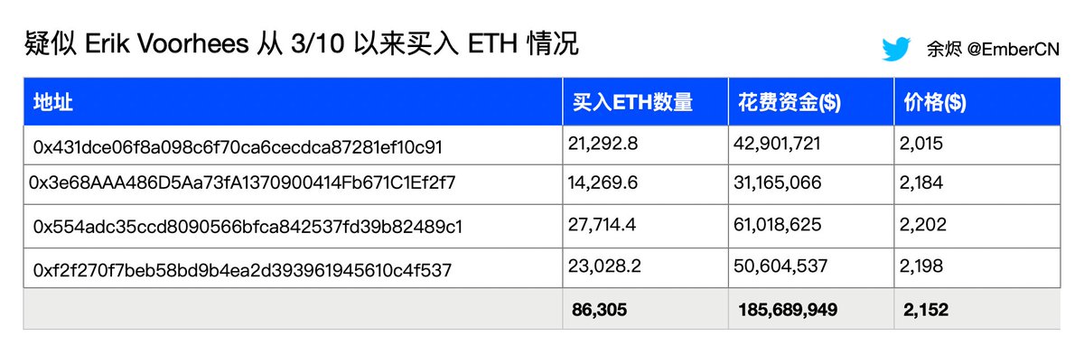 从 3/10 以来,应该是已经通过 4 个钱包共计购买了 8.63 万枚 ETH ($1.85 亿),均价约 $2,152。