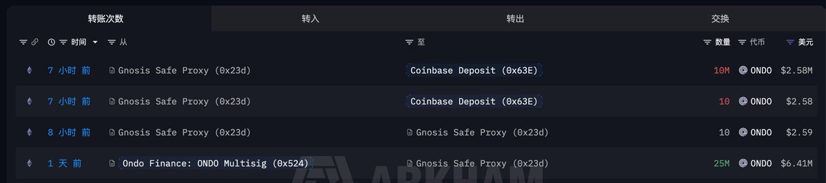 继半个月前 Ondo Finance 的多签钱包把 2447.5 万枚 $ONDO ($612 万) 转进 Coinbase 后,今天凌晨,Ondo Finance 多签钱包又向 Coinbase 转移了 1000 万枚 $ONDO ($258 万)。